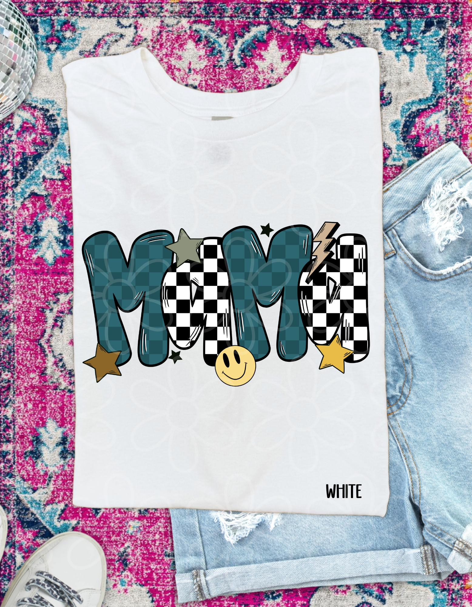 Blue Checkered Retro Smiley MaMa Completed Tee