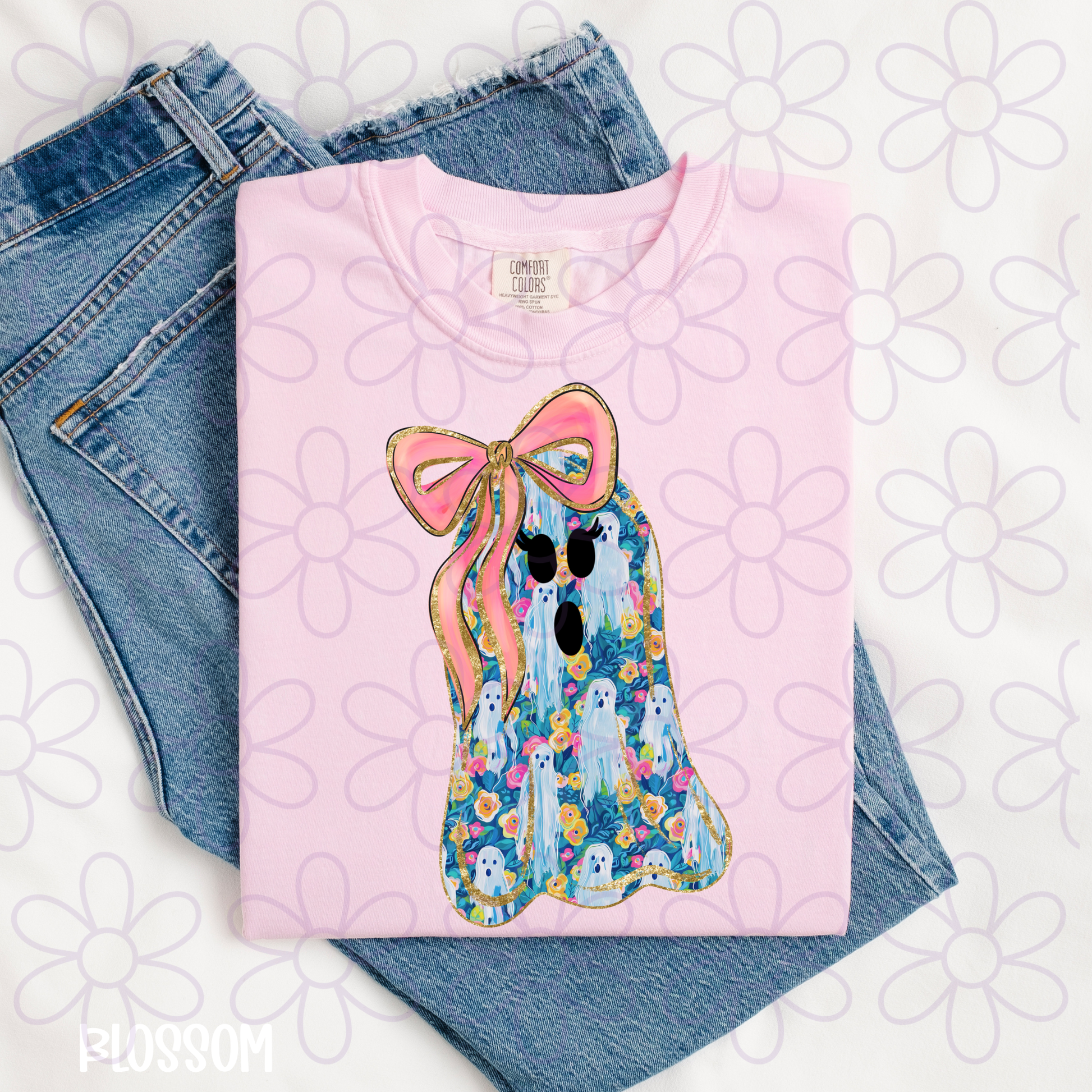 Blue Floral Ghosts Pink Bow DTF Transfer
