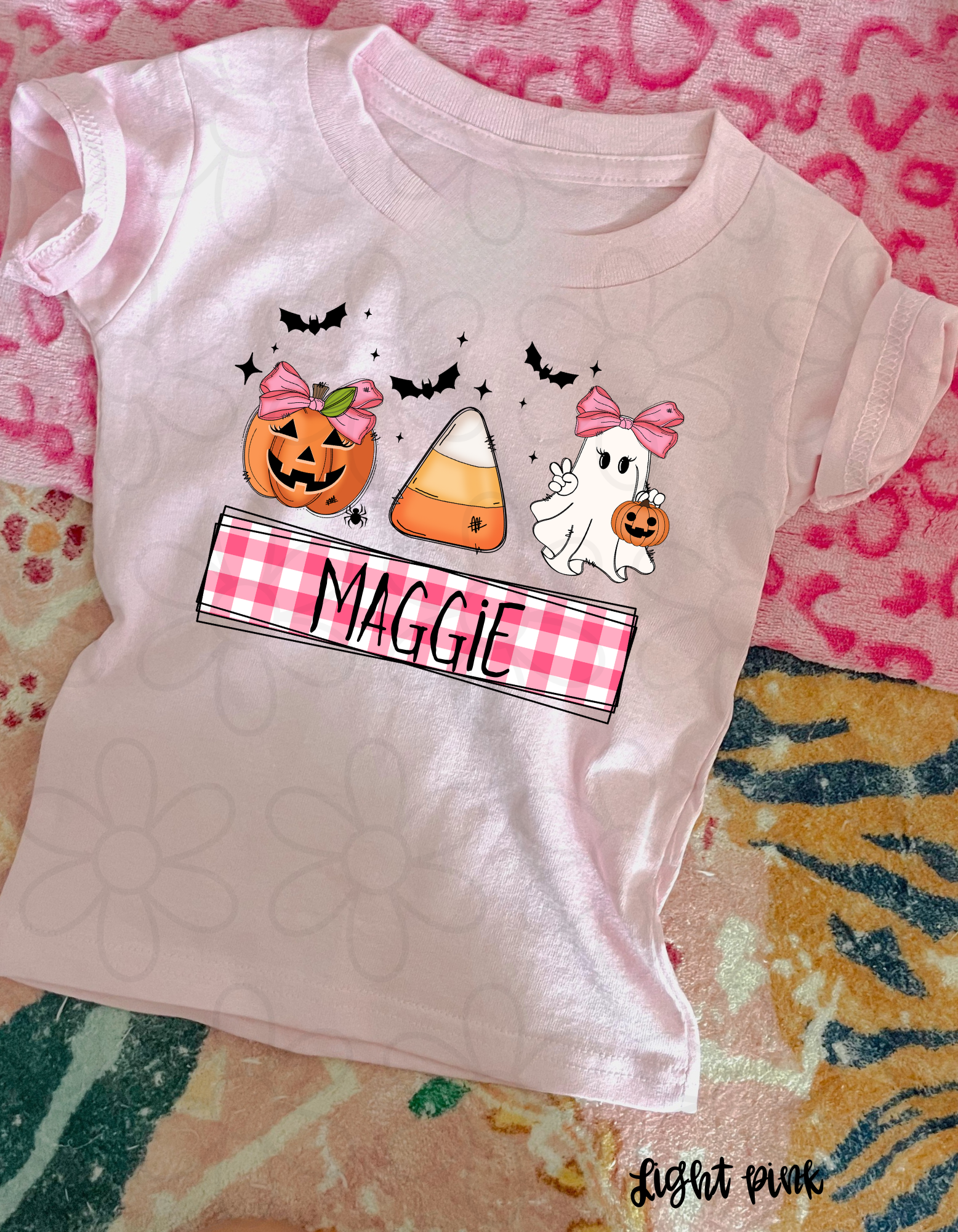 Pink Plaid Halloween Custom Name Kids Completed Tee