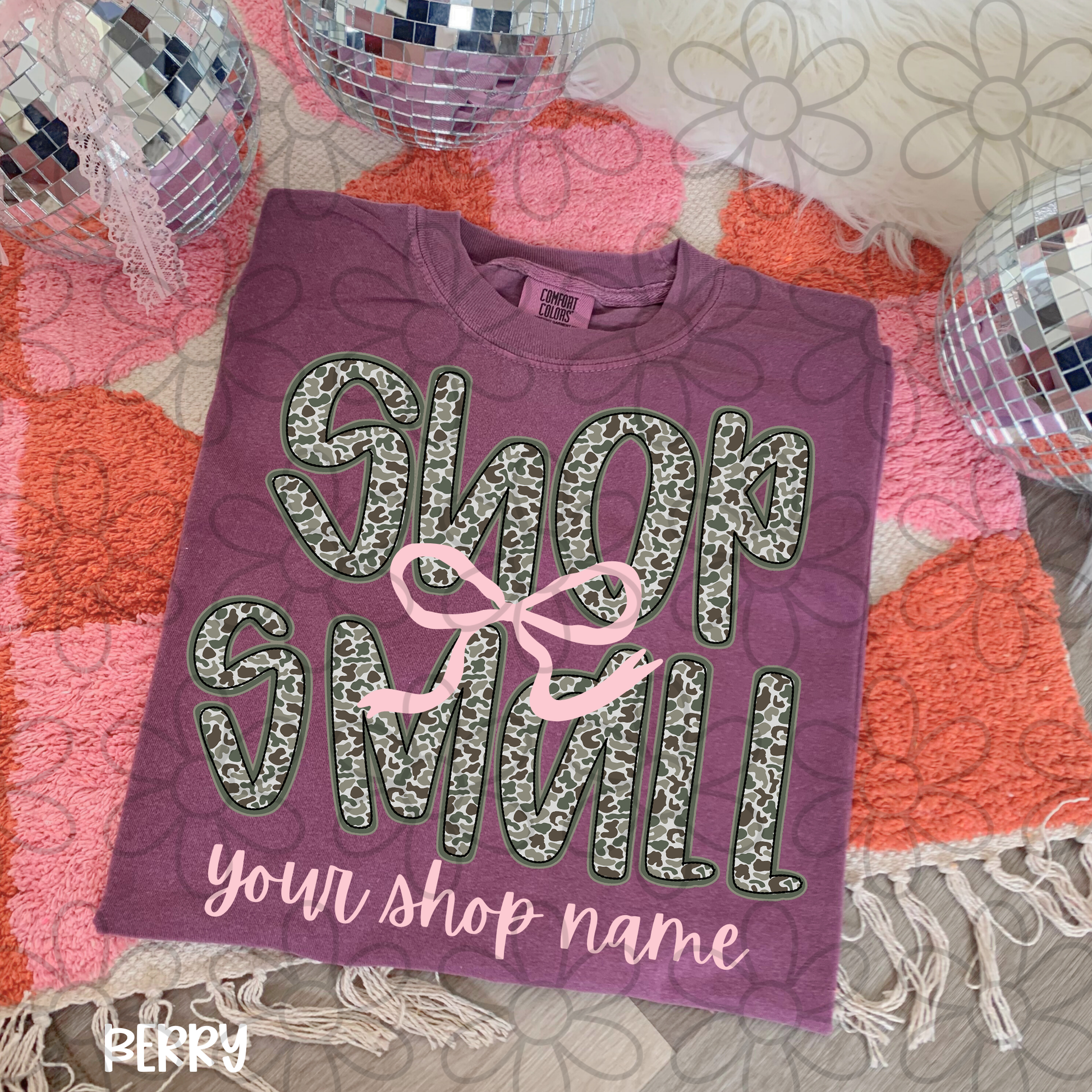 Shop Small Camo Pink Bow Custom Name Completed Tee